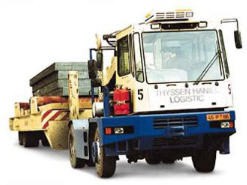 he heavy lift trailer is well suited for small and medium size lifts, such as generators, transformers, and turbines. It consists of a platform with sets of two wheel bogies. Before loading, cargo is placed on the platform of the trailer. The trailer with cargo is then transported by two tow trucks to a stowage location on board. Using a hydraulic pump which raises the integrated hydraulic pistons, the platform is elevated to enable the positioning of heavy timber or steel supports under the side beams of the platform. The bogies are then pulled out ready for the next lift.