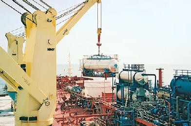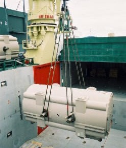 This is a heavy lift ship specially strengthened and equipped with heavy lift derricks. Shown here is a section of oil drilling platform being loaded as deck cargo. A tandem lift is used the spread the load between the derricks.