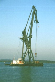 Although most heavy lifts are done with the ship’s own equipment, some ports have a floating crane. This is the Canute at Southampton which has a 200 tonnes capability