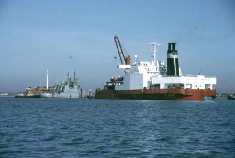 This is is a semi-submersible vessel. As the term semi-submersible implies, the vessel can load and unload main-deck cargo by sinking low enough to allow cargo to float on and off. This is accomplished by a process known as ballasting, taking on water in special internal tanks which can lower the ship up to 26 feet below her normal draft in about six hours. It takes about the same amount of time to return the vessel to her normal draft. Though semi-submersibles were designed primarily to move large and unwieldy off-shore oil rigs, they soon proved equally adept at transporting small naval vessels and other military hardware.